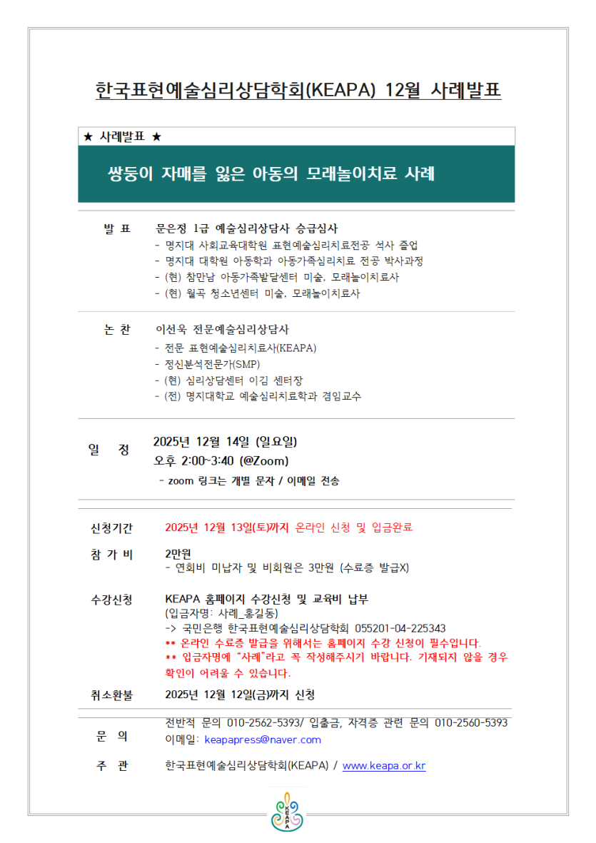 [사례발표] 12월 사례발표 안내 페이지 정보 작성자 최고관리자 조회110회 작성일 25-11-26 12:31 본문 수강신청 바로가기 https://www.keapa.or.kr/bbs/board.php?bo_table=02_05&wr_id=368 목록 답변