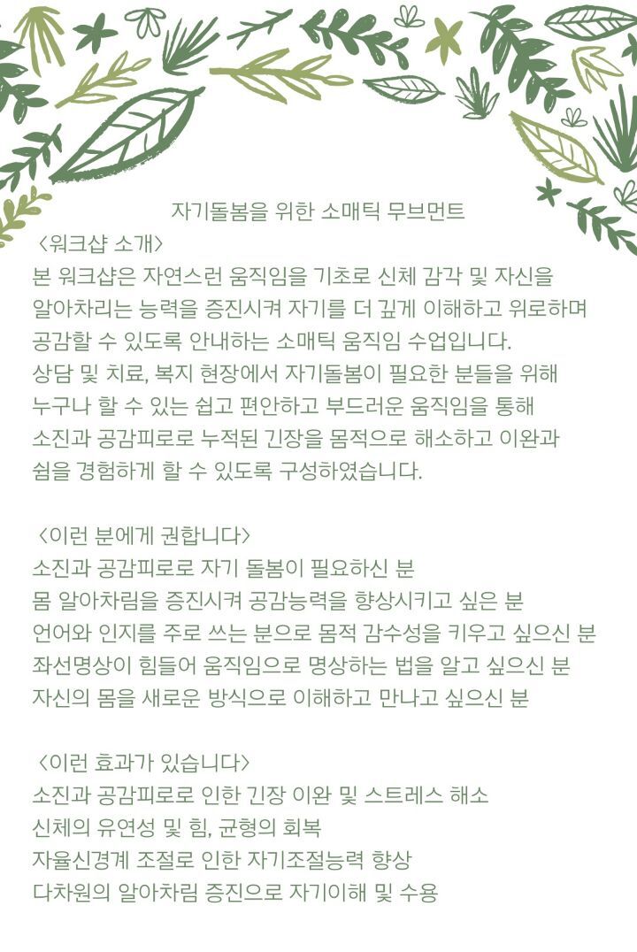 [신체심리치료] 자기돌봄을 위한 소매틱무브먼트 페이지 정보 작성자 전지영 작성일 21-02-15 12:36 조회 6,796회 댓글 0건 본문 [신체심리치료] 자기돌봄을 위한 소매틱무브먼트에 초대합니다. 관련링크 https://m.cafe.daum.net/dreamingafrica/KQXA/318?svc=cafeapp 5622회 연결 이전글사단법인 아동청소년마음을키우는사람들 / 회원 온라인 총회 자료 동의서용 회신서 (표1) 다음글[수&목 놀이치료사 구인] 중랑구소재 치료센터 목록 댓글목록 댓글목록 등록된 댓글이 없습니다.
