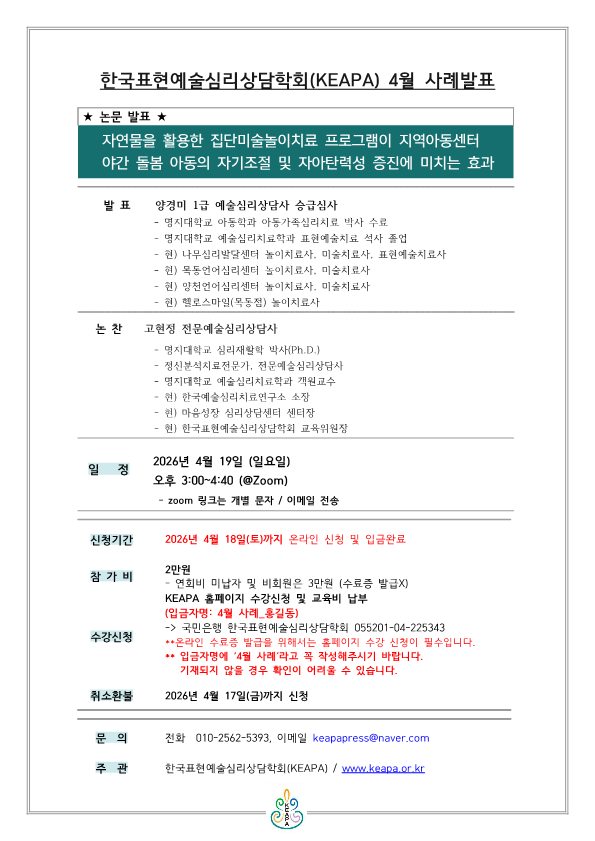 안녕하세요, 한국표현예술심리상담학회입니다.26년 4월 사례발표(논문발표) 공지드리오니 많은 참여 부탁드립니다. 감사합니다.