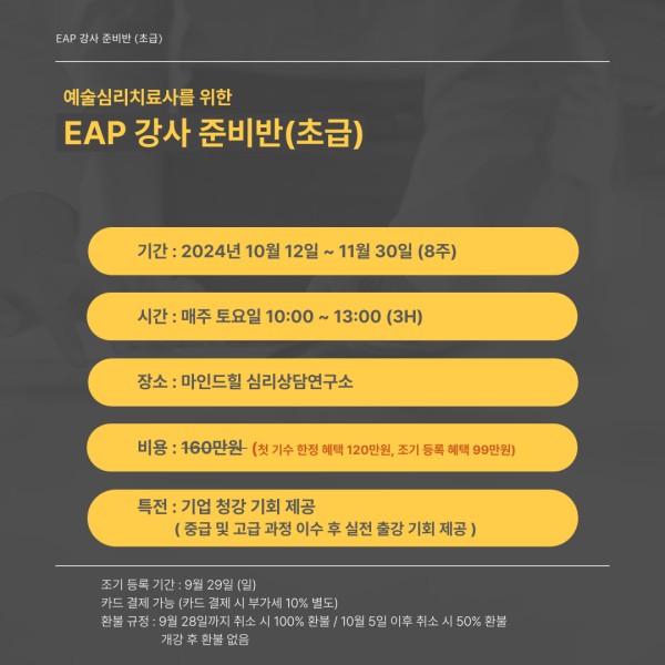 예술치료사를 위한 EAP 전문강사 양성과정 참여자 모집(초급) 페이지 정보 작성자 장미이름 작성일 24-09-13 15:18 조회 894회 댓글 0건 본문 ** 본 초금과정 이수 시 전문 EAP강사의 보조강사로 활동기회를 제공합니다. **** 중급이상 과정을 수료하시면 책임강사로 강의 기회를 제공해 드립니다.**문의_ 010 9616 9670 이전글공익사업 프로젝트 참여자 모집 안내 예술로 리프레시 " 자기실현을 향하여 " 다음글ICP-IFPS 정신분석가 초청 심포지움: 동시대 정신분석의 결 목록 댓글목록 댓글목록 등록된 댓글이 없습니다.