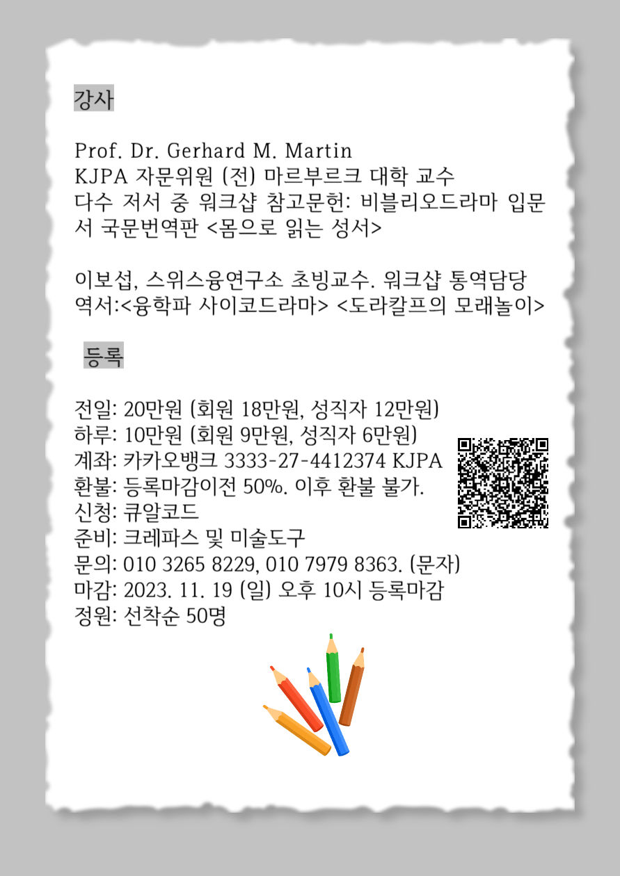 2023 KJPA 온라인 국제 워크샵 페이지 정보 작성자 길은영 작성일 23-11-08 16:34 조회 5,464회 댓글 0건 본문 신청:https://forms.gle/yNQpFEb2qiW8fKzT8 이전글사이코드라마를 활용한 집단미술치료 다음글2023년, 보살핌의 연결_문턱이 낮은 미술치료 워크샵 시리즈 목록 댓글목록 댓글목록 등록된 댓글이 없습니다.