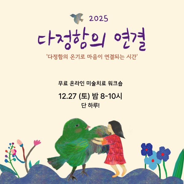 <슬픔의 연대> 2025 다정함의 연결(무료 온라인 미술치료 워크숍) 페이지 정보 작성자 최고관리자 작성일 25-12-12 14:17 조회 157회 댓글 0건 본문 이전글사단법인 2026 비상근 무보수 임원, 활동이사 선임 공고. AMAKISA 다음글Healing Movement 탈춤 - 2025 국제예술치료협회 무용치료분과 후원 목록 댓글목록 댓글목록 등록된 댓글이 없습니다.