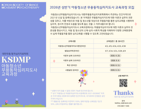 2026 상반기 아동청소년 무용동작심리지도사 교육과정 모집 / KSDMP